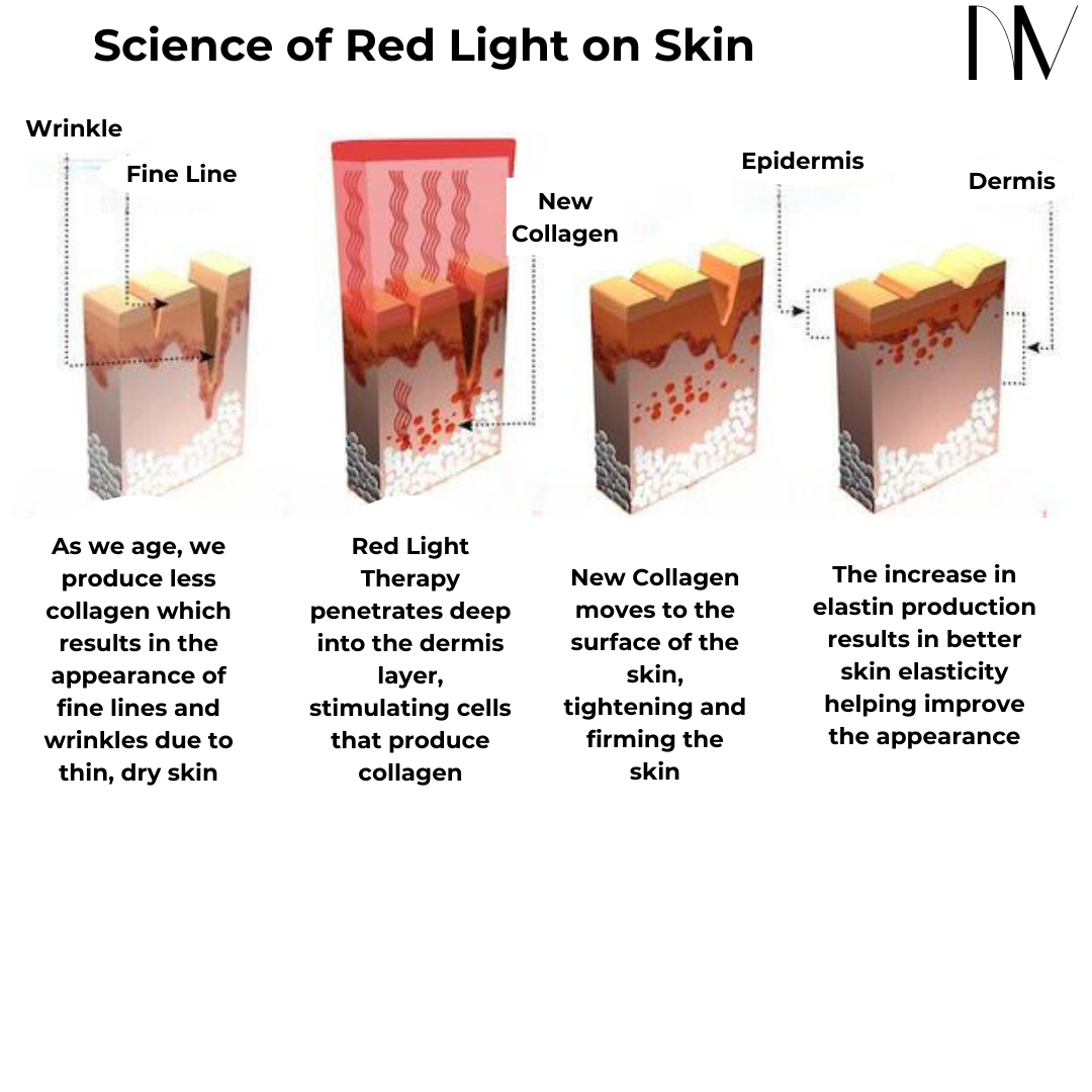 - Collagen production: NIR stimulates fibroblasts in the skin, leading to increased collagen production. This helps improve skin elasticity, reduces fine lines and wrinkles, and promotes a more youthful appearance.
